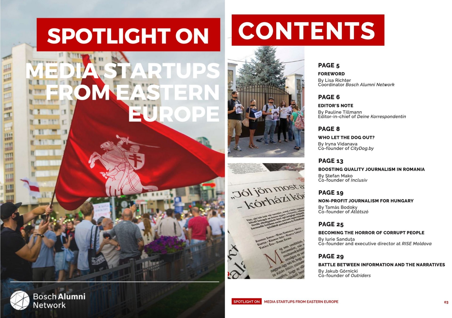 Zusammen mit dem Robert Bosch Alumni Network und Koordinatorin Lisa Richter habe ich diese kostenfreie Publikation 2021 – mitten in der Corona-Pandemie – umgesetzt, um zu zeigen, wo es überall bemerkenswerte neue, innovative Medienpublikationen in Osteuropa gibt. Ein besonderer Dank gilt an unsere Gastautor*innen Iryna Vidanava (CityDog), Stefan Mako (Inclusiv), Tamas Bodoky (Atlatszo), Iurie Sanduta (RISE Moldova) und Jakub Gornicki (Outriders).